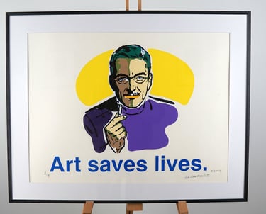 Between 2002 and 2004, James Canfield created a series of politically charged lithographs that blend pop art aesthetics with pointed social commentary. Working with clip art-inspired imagery, he transformed familiar visuals into subversive statements on American culture and personal freedom. Pieces like "Art Saves Lives," "Ban the Bomb," and "I Believe in Free Will" showcase his ability to pair bold graphics with layered meanings—sometimes humorous, sometimes confrontational, always deliberate. Each piece is a numbered edition lithograph, hand-pulled, signed, and dated by Canfield.